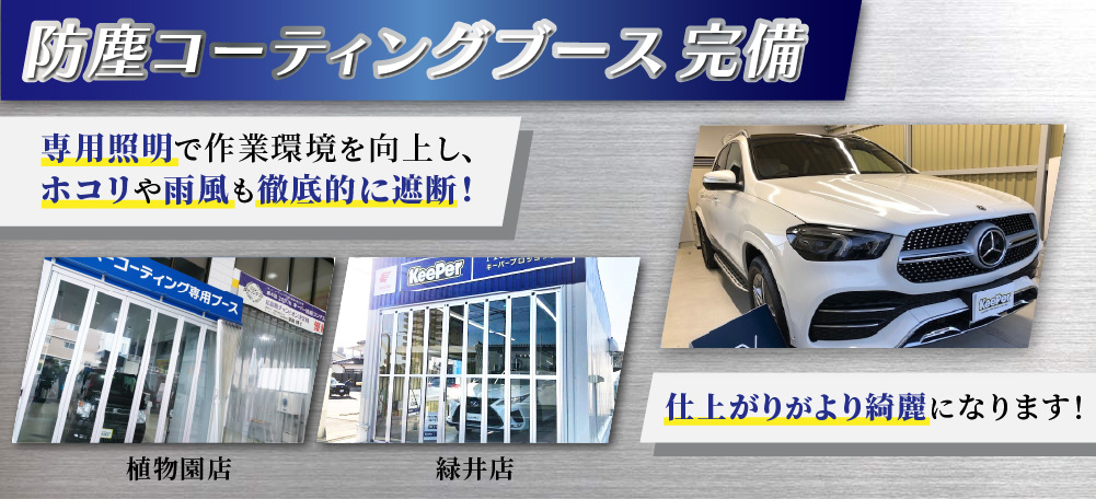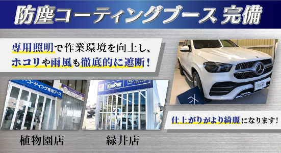 広島緑井店・広島植物園店の両店とも専用の防塵コーティングブースを完備しており、細かい埃や日光を遮断した環境下で作業を実施いたします!